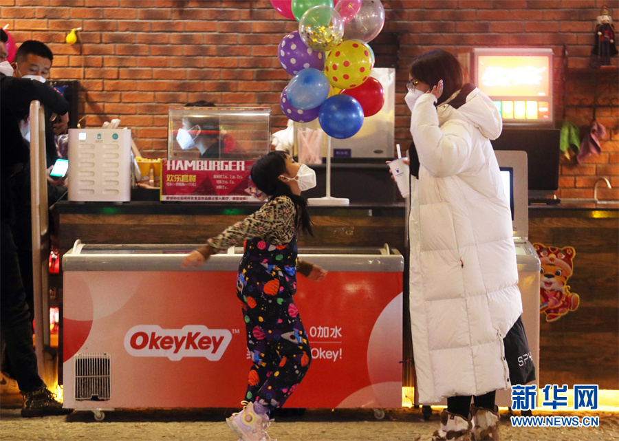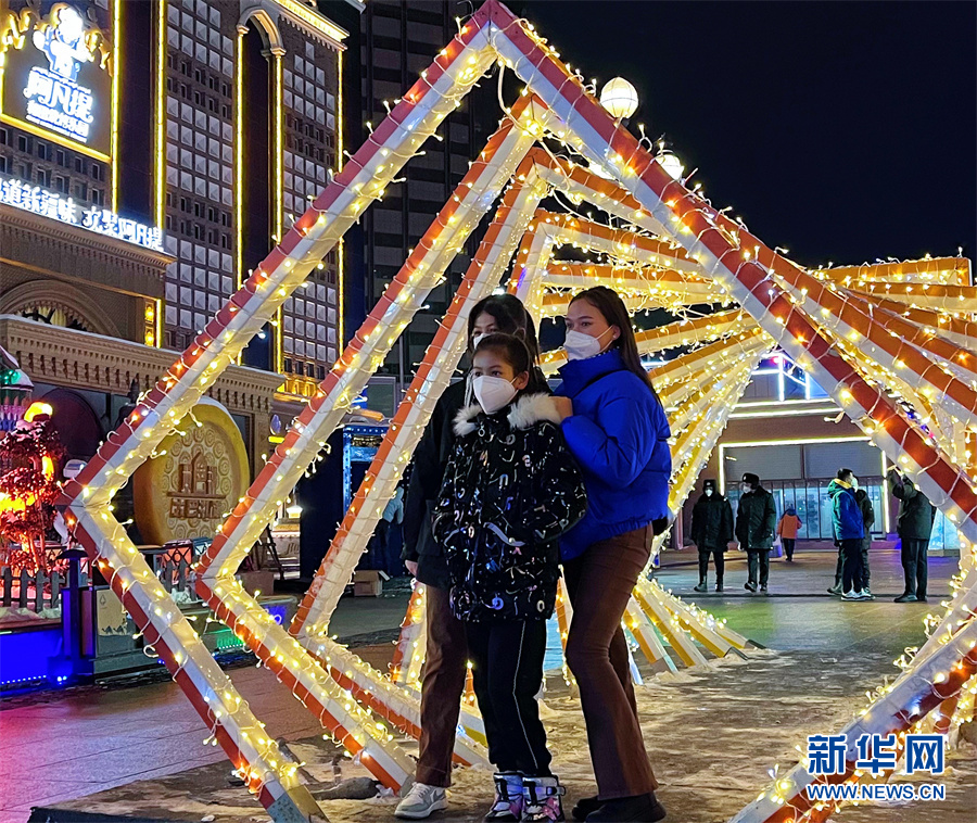 12月18日20时,在大巴扎步行街A区时光隧道前,米曼汗·多来提和5岁的女儿麦丽开姆·努尔艾麦提摆好造型拍照“打卡”。