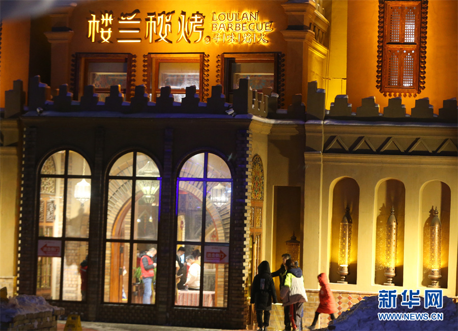 12月17日晚,消费者正在进入乌鲁木齐高新区(新市区)丑马一号文创园楼兰秘烤。