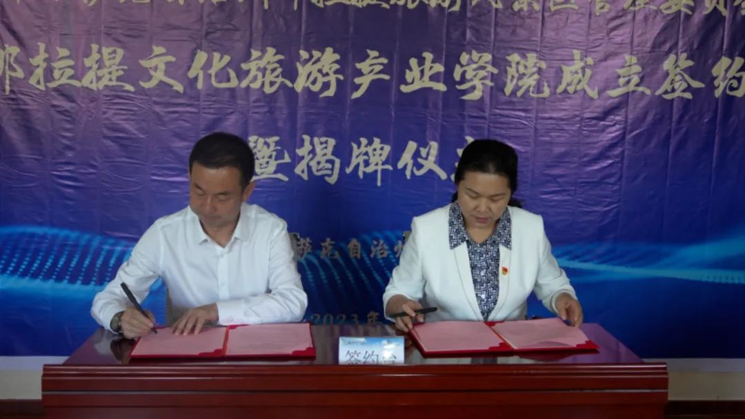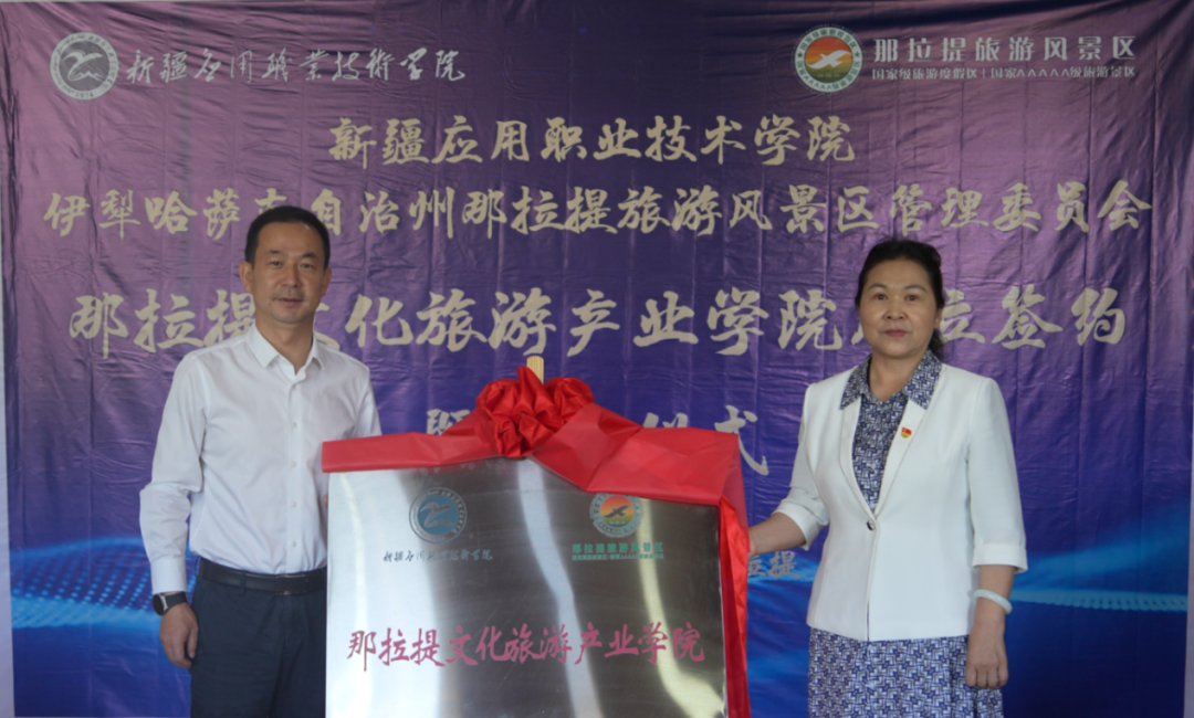 为切实推动《关于深化现代职业教育体系建设改革的意见》《职业教育产教融合赋能提升行动实施方案(2023—2025年)》有效实施,统筹职业教育、高等教育、继续教育协同创新,推动职业教育产教融合高质量发展,助推学院打造高质量教育体系,夯实职业院校发展基础、建设产教融合实训基地、深化产教融合校企合作。2023年7月7日,新疆应用职业技术学院于伊犁哈萨克自治州那拉提旅游风景区管理委员会隆重举办了“那拉提文化旅游产业学院成立签约暨揭牌仪式”,正式签订“共建那拉提文化旅游产业学院合作协议”,并挂牌成立“那拉提文化旅游产业学院”。