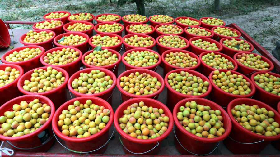 从杏园里采摘好即将进行分选包装的小红杏。林国强摄
