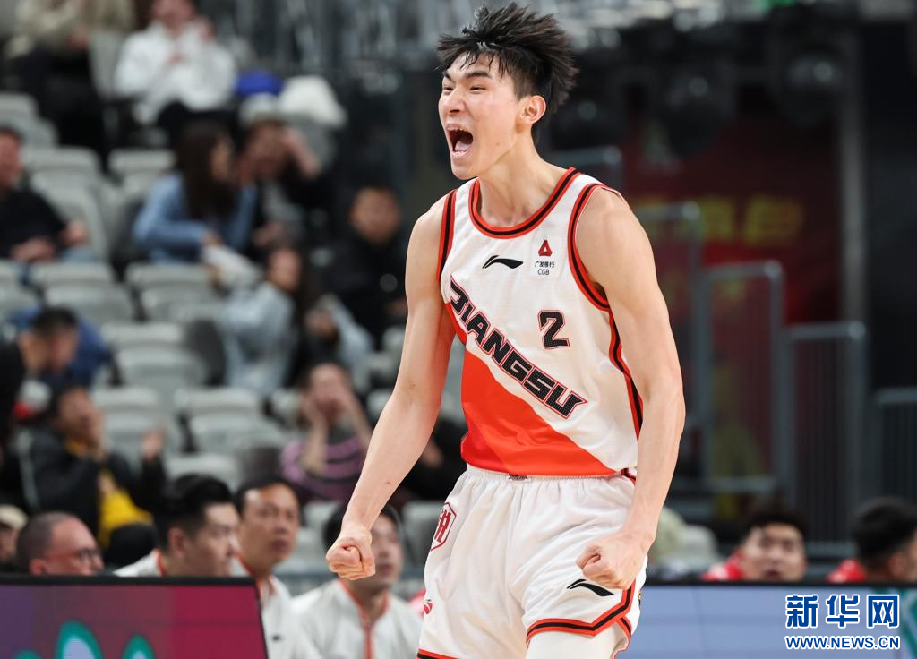 12月13日,江苏肯帝亚队球员马建豪庆祝投进三分球。新华社记者 胡虎虎 摄pagebreak