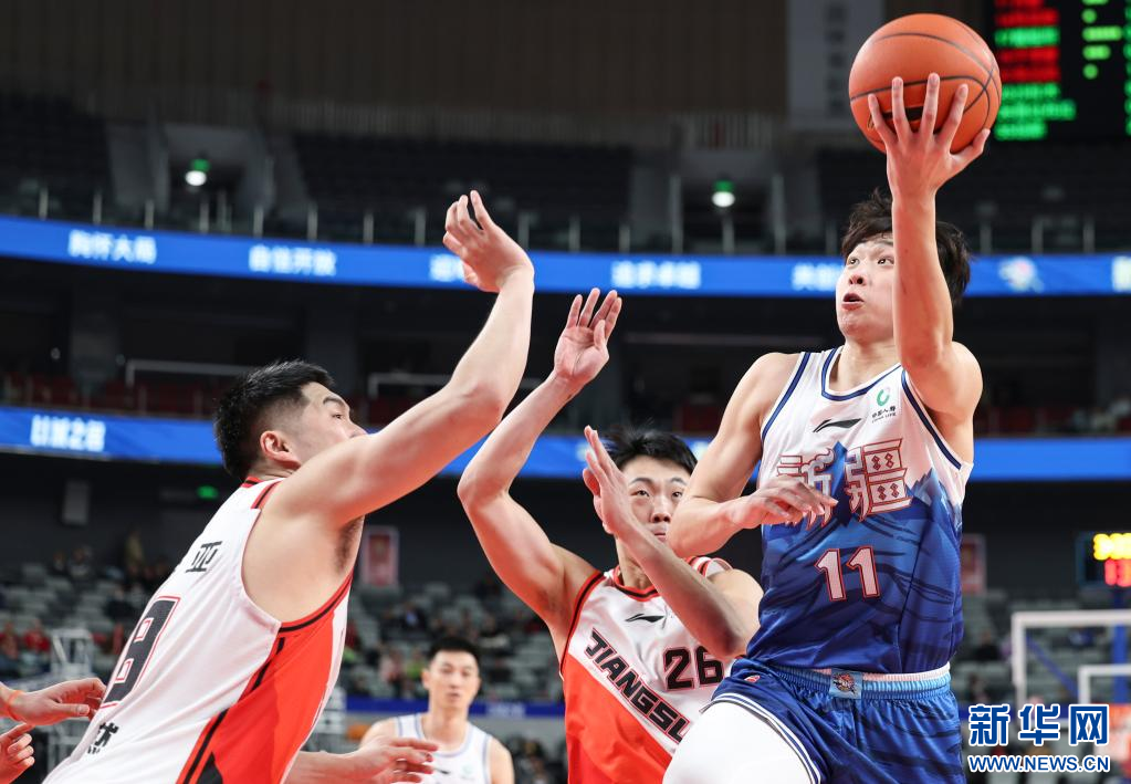 12月13日,新疆伊力特队球员齐麟(右)在江苏肯帝亚队球员蒋浩然(左)、陶彦儒的夹击防守下上篮。