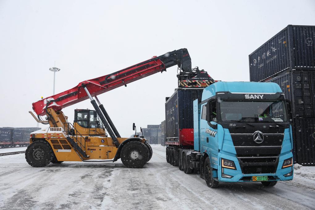 12月22日,在新疆生产建设兵团第八师石河子市多式联运国际综合物流港,工人操作机械装载货物。