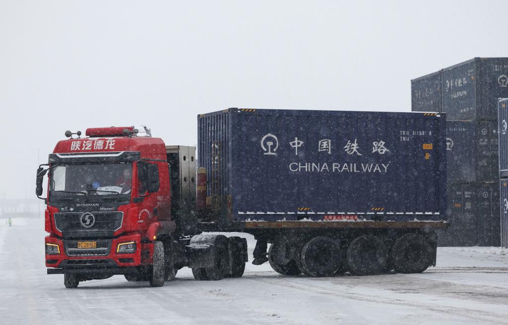 12月22日,车辆在新疆生产建设兵团第八师石河子市多式联运国际综合物流港内运输货物。
