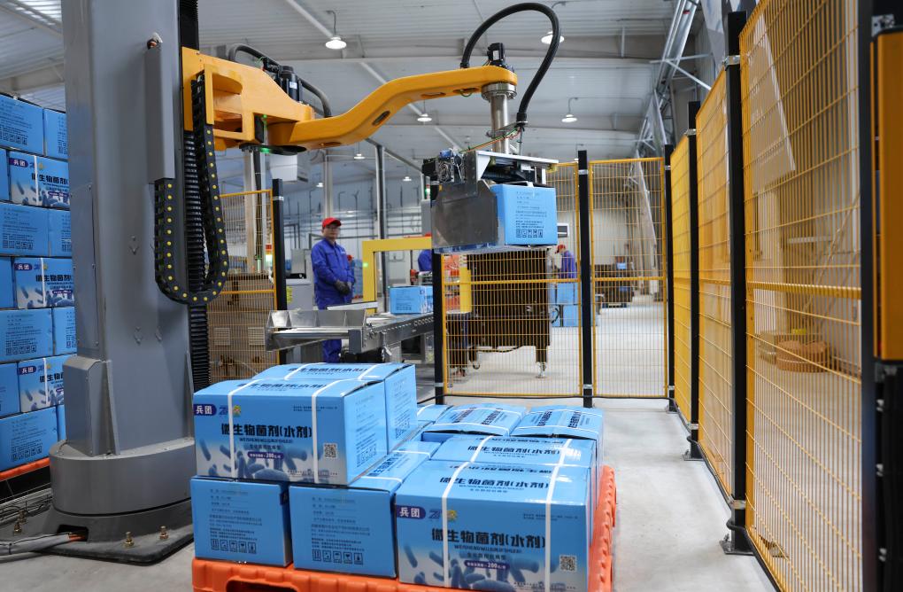 12月21日,在新疆生产建设兵团第六师五家渠市一家生物科技企业的灌装车间,智能设备在搬运产品。新华社记者 胡虎虎 摄