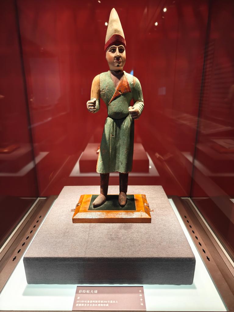 展览中展出的彩绘驼夫俑(唐)。新华社记者周润健 摄