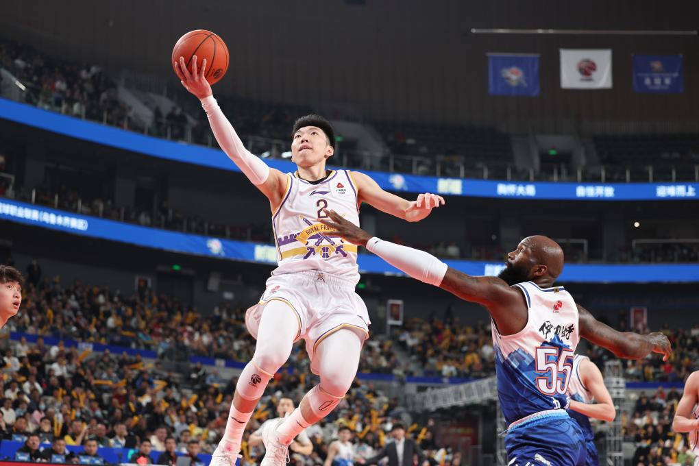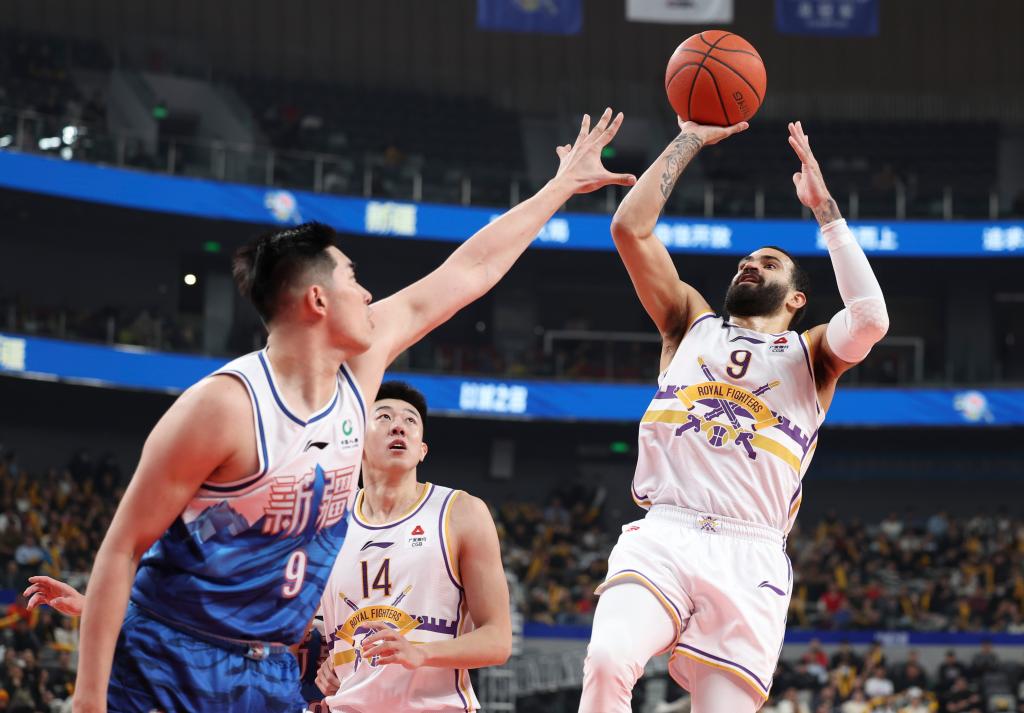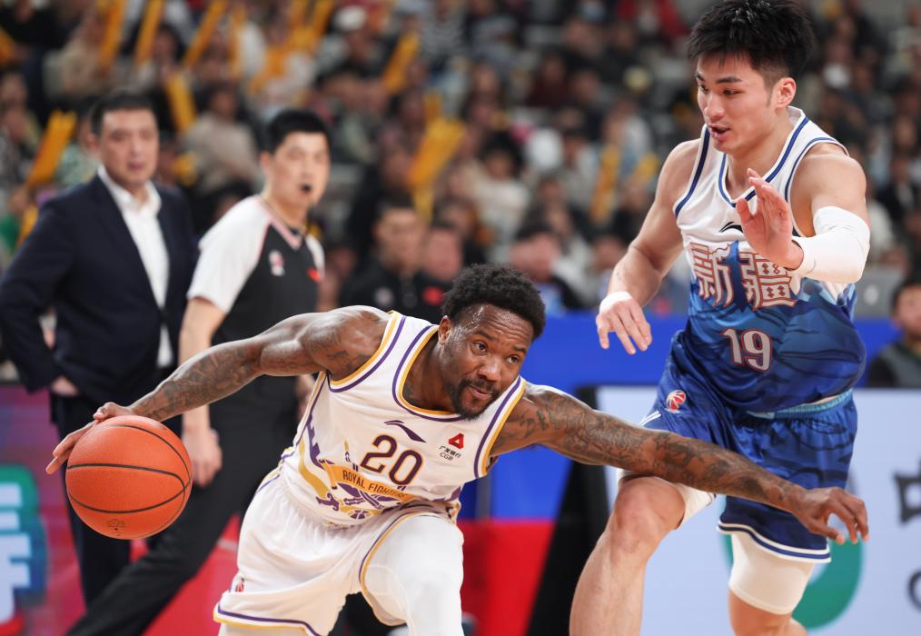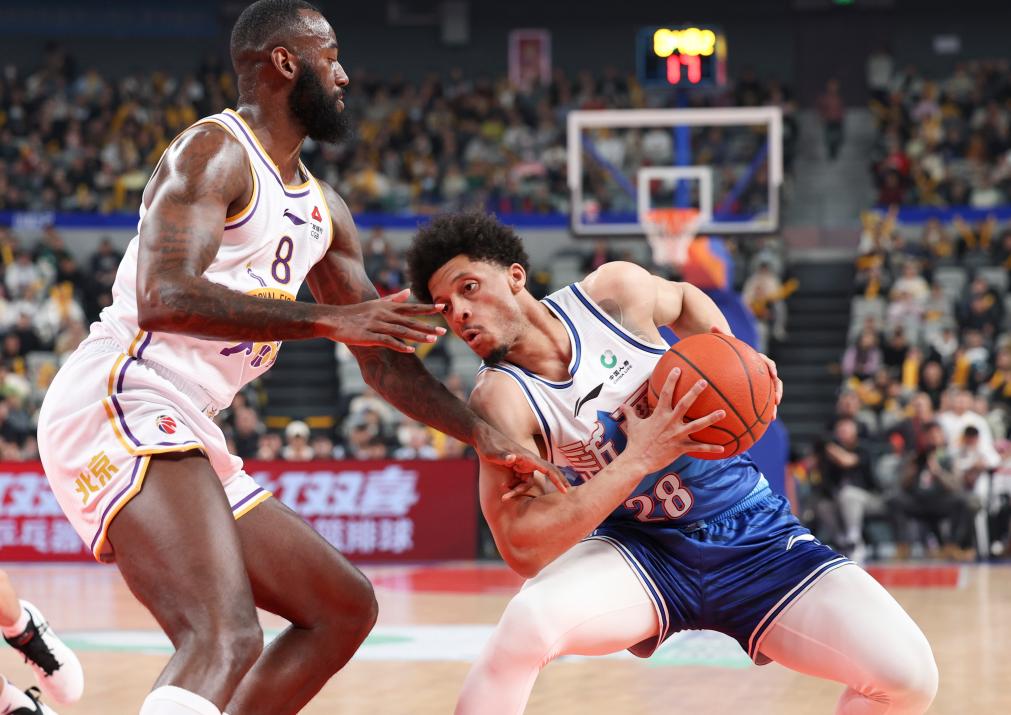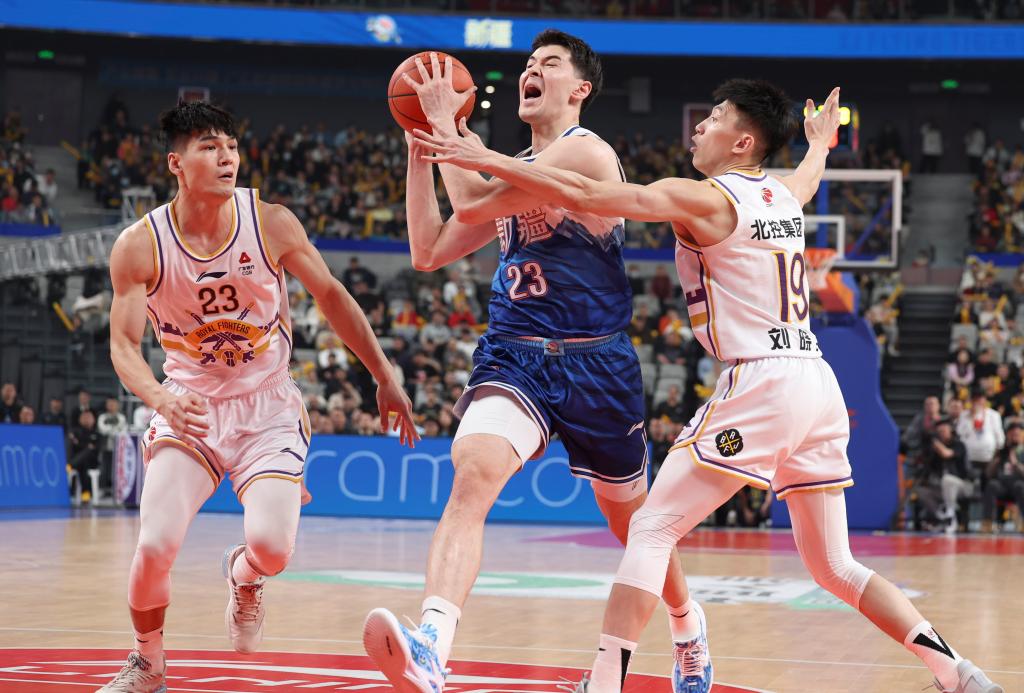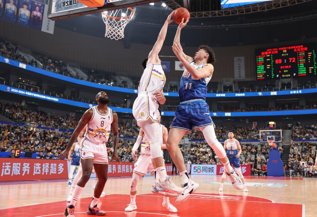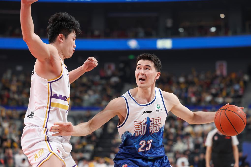 当日,在2023-2024赛季中国男子篮球职业联赛(CBA)常规赛第41轮比赛中,新疆伊力特队主场102比95战胜北京控股队。新华社记者 胡虎虎 摄