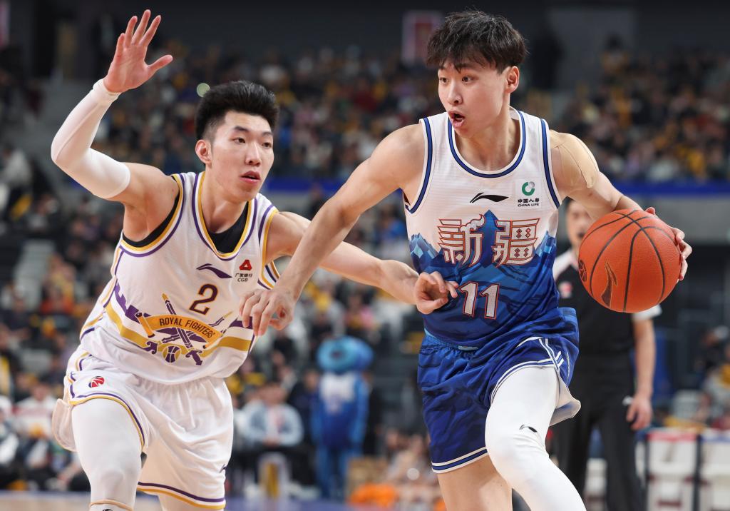 3月10日,新疆伊力特队球员齐麟(右)带球突破北京控股队球员廖三宁的防守。新华社记者 胡虎虎 摄