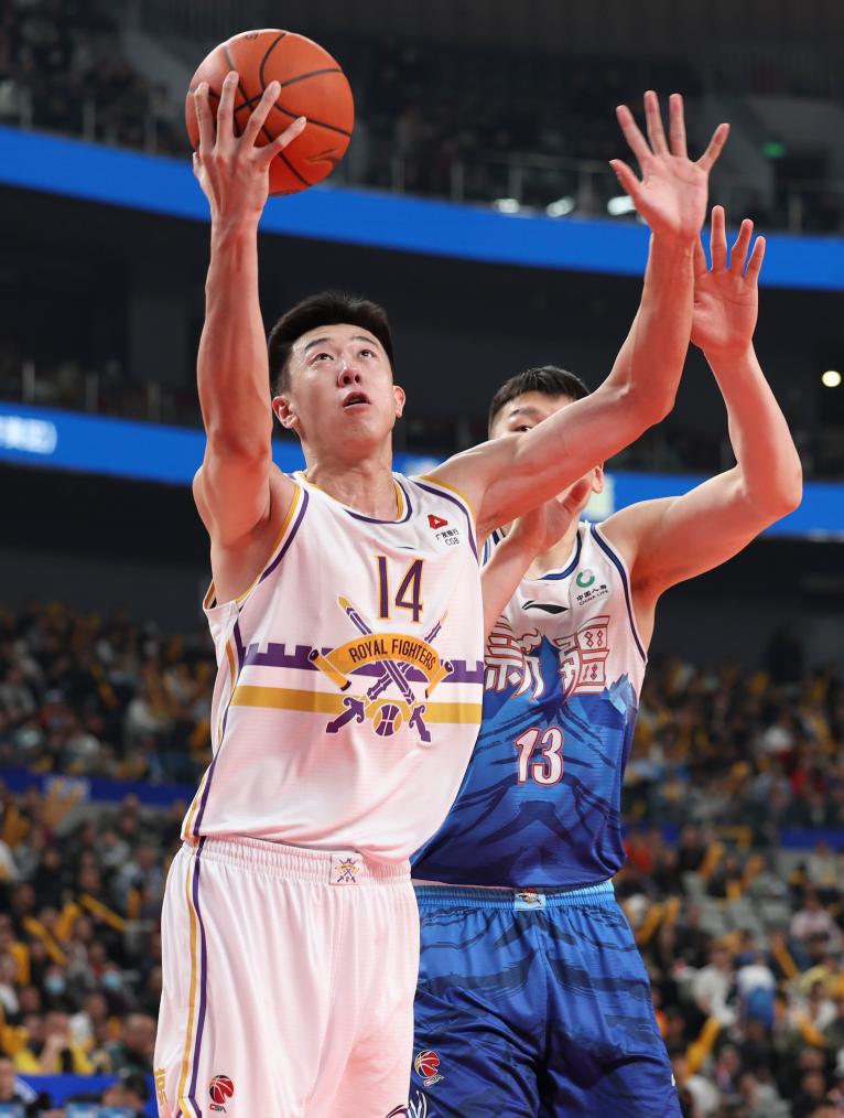 3月10日,北京控股队球员王少杰(左)在新疆伊力特队球员李炎哲的防守下上篮。新华社记者 胡虎虎 摄