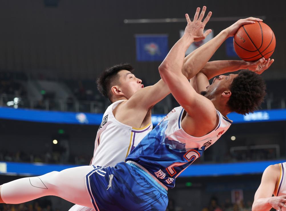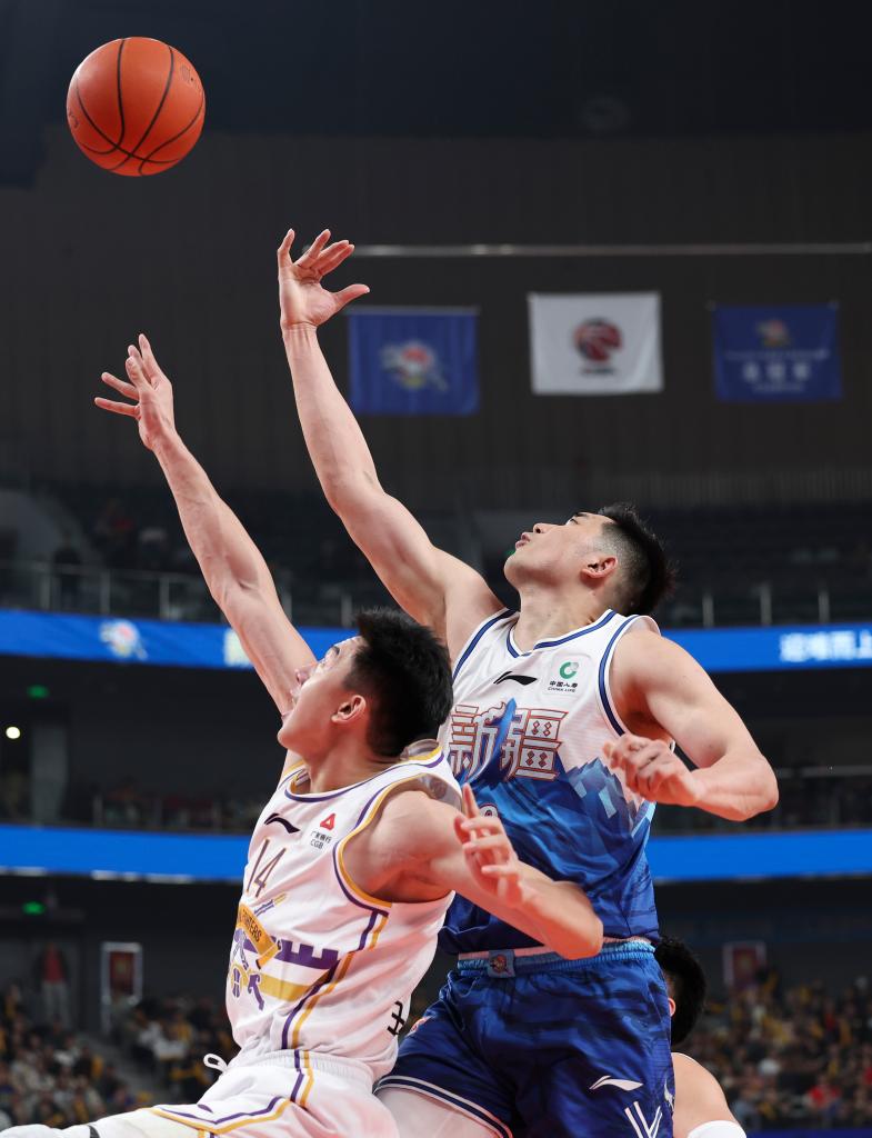 3月10日,北京控股队球员王少杰(前)与新疆伊力特队球员吴冠希争抢篮板球。新华社记者 胡虎虎 摄