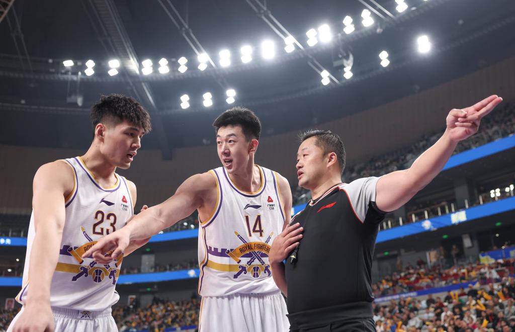 3月10日,北京控股队球员王少杰(中)、陈国豪(左)和裁判在比赛中沟通。新华社记者 胡虎虎 摄