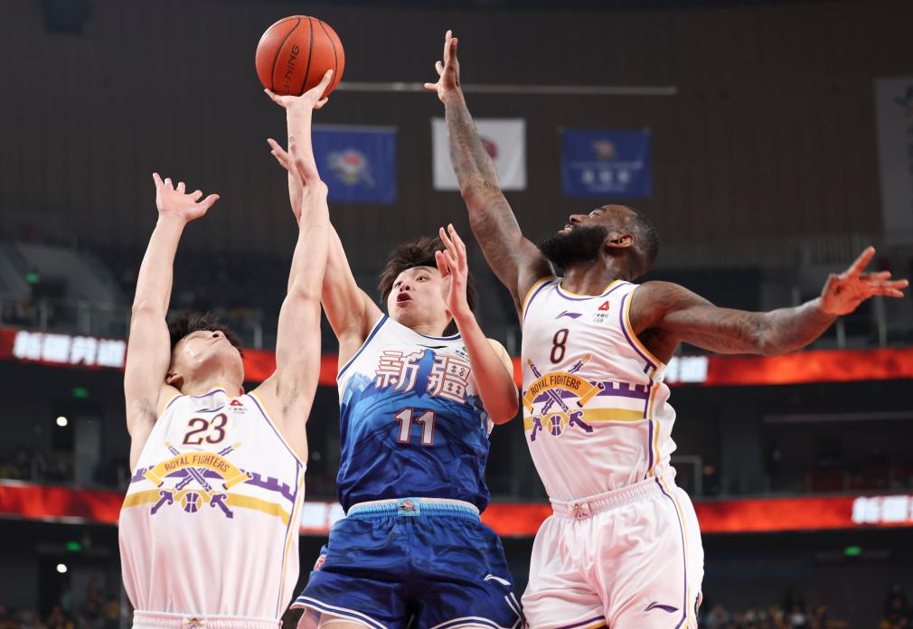 3月10日,新疆伊力特队球员齐麟(中)在北京控股队球员桑普森(右)、陈国豪的夹击防守下投篮。新华社记者 胡虎虎 摄