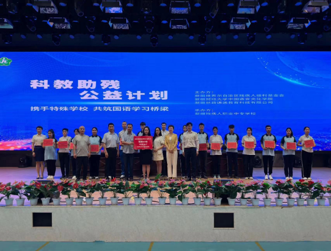 新疆残疾人福利基金会联合新疆财经大学中国语言文化学院、新疆丝路语通教育科技有限公司共同发起的“数字赋能,搭建国通语助残学习桥梁”科技助残公益计划为全校师生赠送了600套国家通用语言文字学习软件和部分教学系统软件,帮助学生们更好地掌握国家通用语言文字,提高语言能力和社会适应能力。