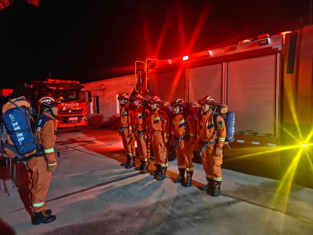10月17日晨,阿合奇县消防救援大队交通路消防救援站消防员正在集结,准备前往受地震影响区域排查情况。新华社发(肉孜买买提·艾山吐尔 摄)