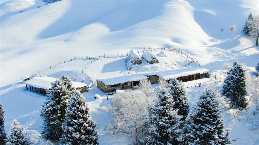 一场雪后,那拉提草原,宛如被大自然精心雕琢的冰雪仙境,一片银装素裹,静谧而圣洁。棵棵树木好似披上了纯净洁白的盛装,树挂晶莹剔透,像大自然馈赠的白色锦袍,如霜花绽放,每一寸都彰显着冬日的浪漫与诗意。洁白无垠的雪地上,树木的影子清晰倒映着,影影绰绰,犹如一幅幅水墨画卷。在这如梦似幻的冰雪世界里,牧民的冬窝子恰到好处地点缀其中,为这片静谧的白色天地,增添了几分人间烟火的温馨与灵动。