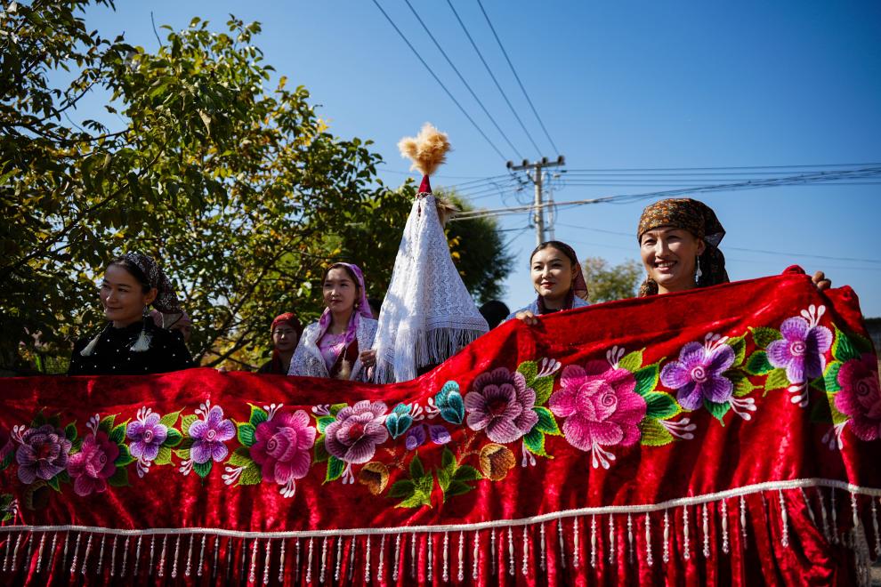 中午,车队抵达加尔阔拉村后,三位乐手弹奏着冬不拉、手风琴、吉他,边走边唱,将新娘迎至布开汗家中小院。民间艺人阿肯弹着冬不拉,带着新娘向男方父母及亲戚行礼,其间,有长辈揭开孔吐斯的面纱,送上祝福。随后,男方亲友协力将被子、家用电器等嫁妆搬进小院。