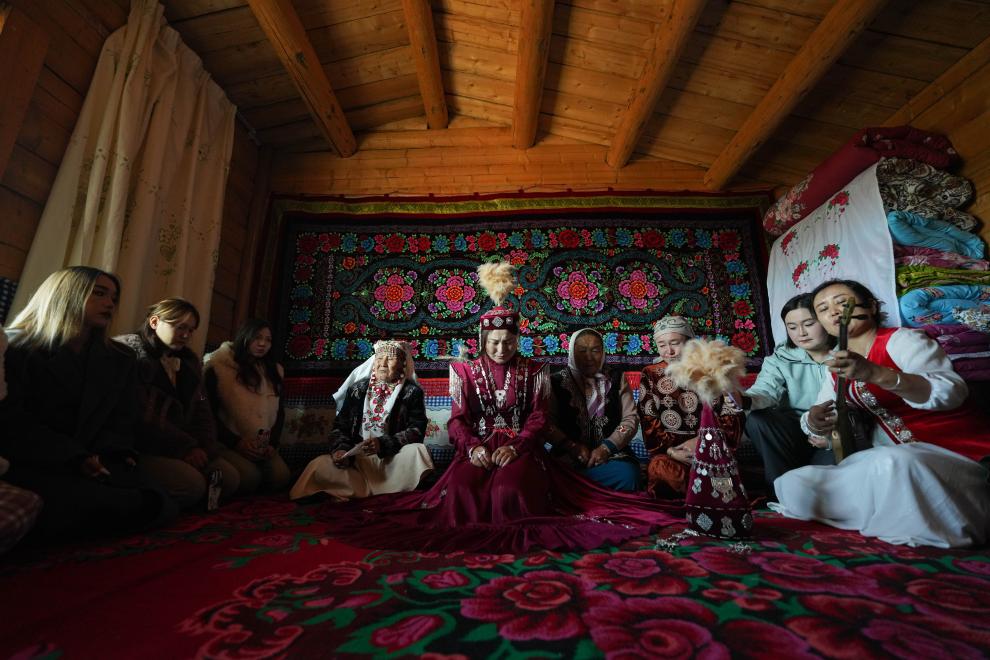 出嫁前一晚,男方亲戚抵达冬牧场,女方家设宴款待,孔吐斯·也斯达吾列提的嫂子(白衣者)在一旁为客人倒奶茶(10月10日摄)。