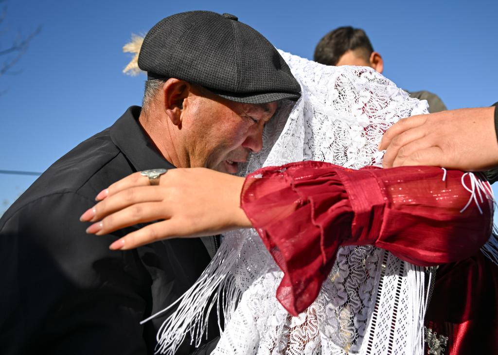 孔吐斯·也斯达吾列提的母亲(右一)在“哭嫁”仪式上落泪(10月11日摄)。