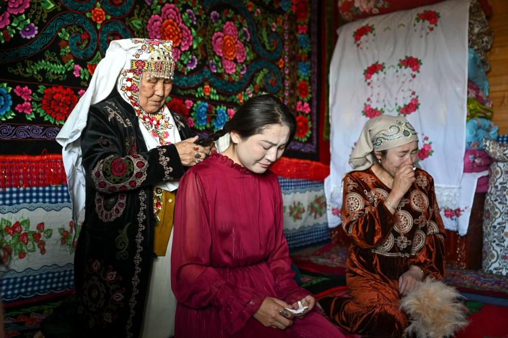 “哭嫁”仪式上,奶奶(左)一边为孔吐斯·也斯达吾列提(中)编头发,一边吟唱歌谣,母亲在一旁落泪(10月11日摄)。