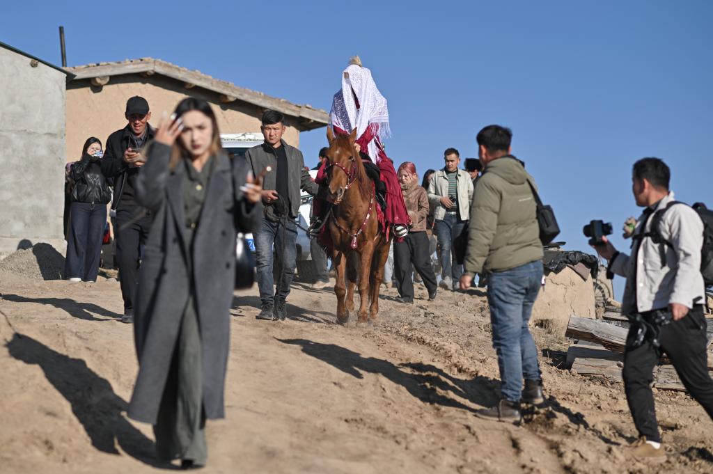 新娘孔吐斯·也斯达吾列提在家门前骑上骏马,离开位于冬牧场的家(10月11日摄)。