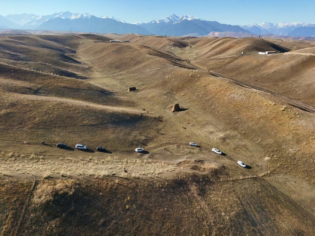 迎亲车队离开冬季牧场,前往新郎家(10月11日摄,无人机照片)。