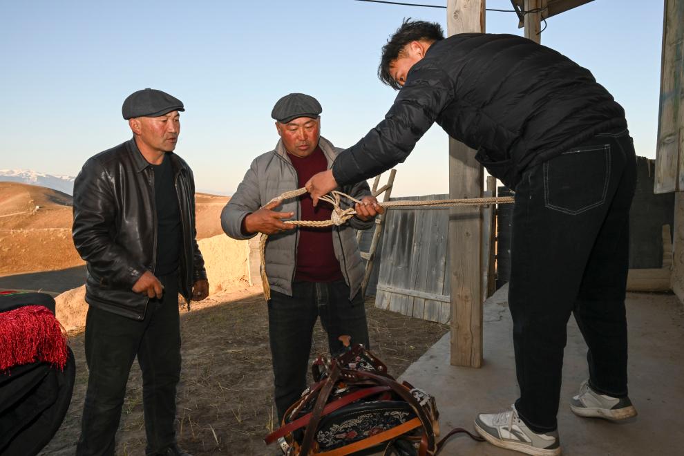 出嫁当天上午,孔吐斯·也斯达吾列提的父亲(左)和亲戚一起准备鞍具等用品,鞍具和马匹是孔吐斯的嫁妆(10月11日摄)。