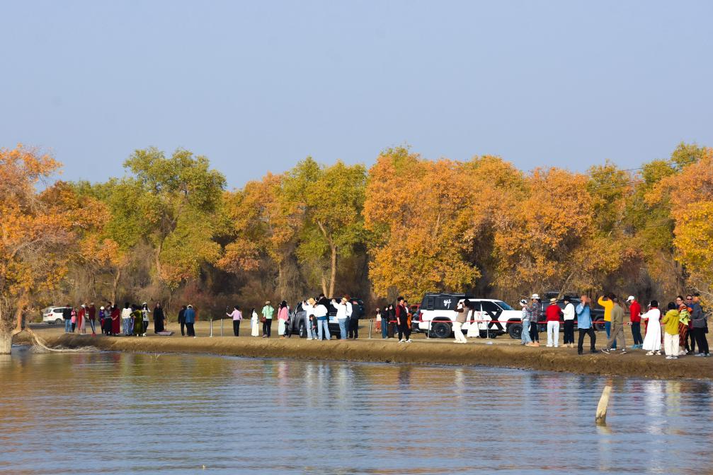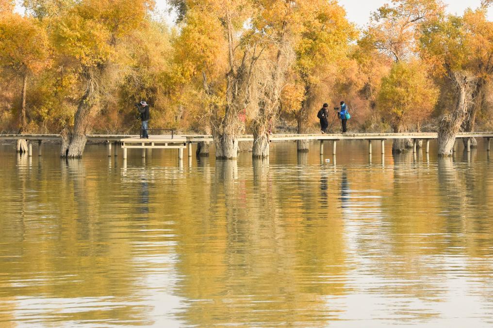 10月22日,游客在新疆阿克苏地区沙雅县沙雁洲景区胡杨林赏景拍照。新华社记者 顾煜 摄