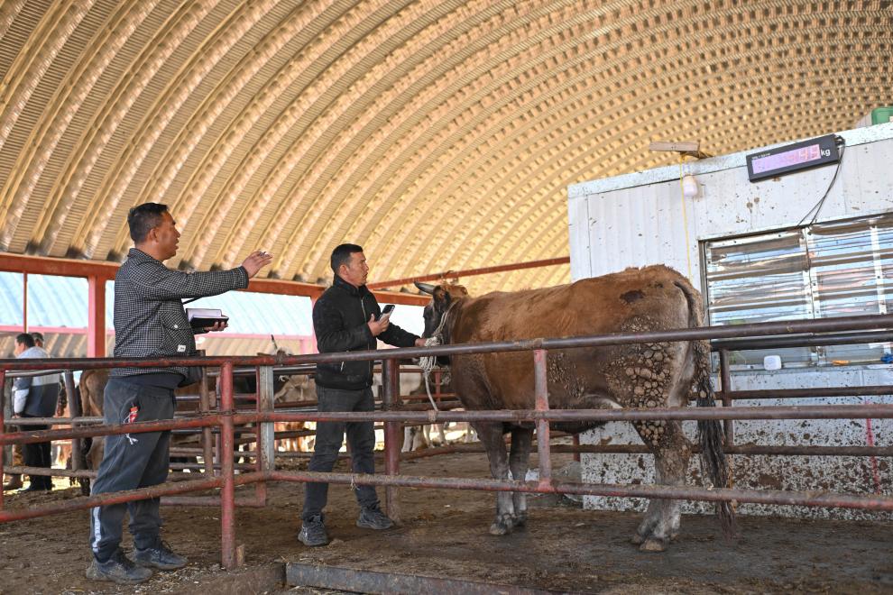 这是马军当日收购的第55头牛身上的标记(12月3日摄)。马军介绍,高峰期单日可收购100多头牛。新华社记者 胡虎虎 摄