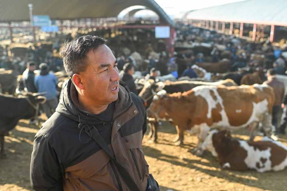 牲畜经纪人马军来自新疆伊宁县,已从业多年。这次,他掌握买家的具体需求后,来到了“皇宫巴扎”。在他看来,牲畜经纪人的首要技能就是准确相中出肉率更高的待售牛羊。丰富的经验让他能摸摸牛的耳朵、肋骨就知道膘情、肉量如何。观毛色、辨品种、看体形、摸关节……选好牛羊后,他就要开始和牧民谈价格。