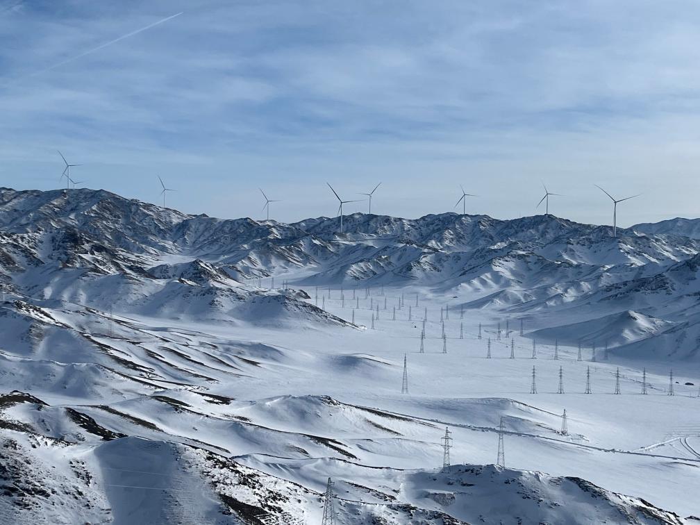 中电神火木垒自备绿电替代风电80万千瓦项目大石头风电一场山头矗立的风力发电机。新华社记者杨林 摄