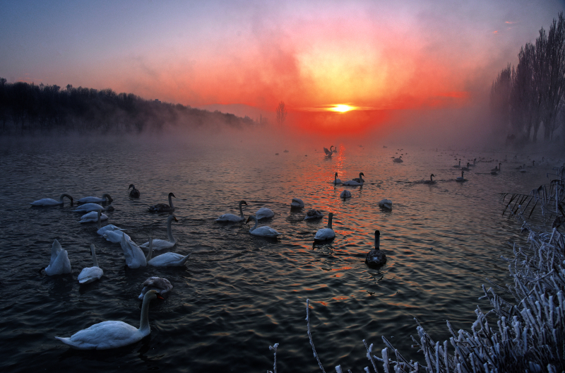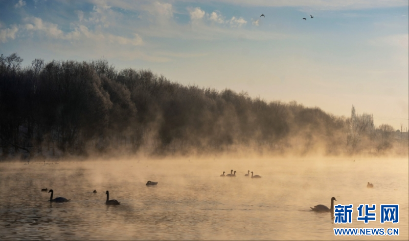 大寒以来,新疆伊宁县天鹅泉连续多日雾凇凝霜、雾气氤氲,远山皑皑白雪映着金色朝霞,成群疣鼻天鹅、大天鹅翩跹起舞,构成一幅梦幻般的冬日画卷。