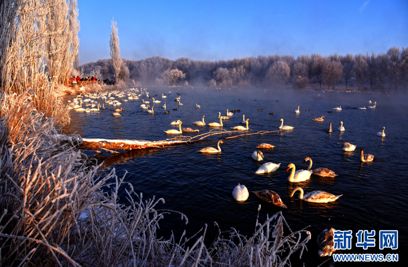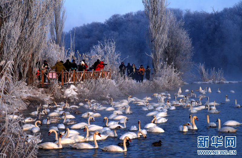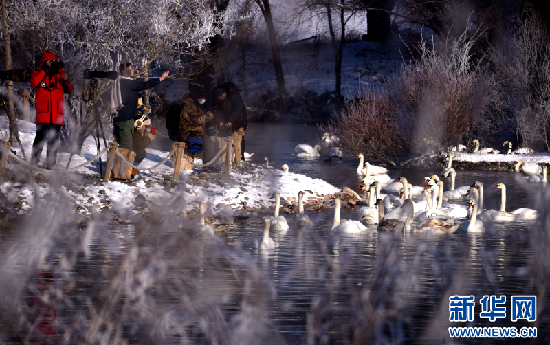 1993年11月,两只疣鼻天鹅带着3个孩子突然飞到夏合勒克村,落在了村民韩新林门口的鱼塘中。韩新林连续几天给天鹅投放食物,帮它们熬过寒冬。没想到,这个善意的举动,引来了越来越多天鹅年年到此过冬。从最初的一家五口,增加到如今超过1000只的庞大家庭。每年冬季,它们从远方如期而至,与这里的雾凇、晨雾和霞光,共同绘就一幅生命与自然相守的温暖画卷。