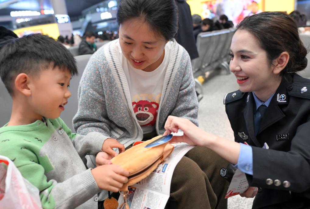 1月30日,在乌鲁木齐铁路公安处举办的“新疆铁警‘警馕’妙计 助您平安回家”安全出行宣传活动中,民警将内置有安全出行卡片的文创产品送给参与活动的旅客。