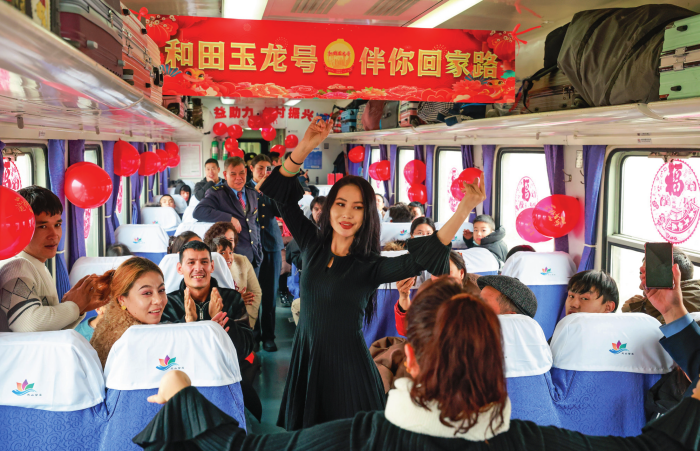 在7557次列车上,旅客随音乐跳起麦西来甫(2025 年 1 月 2 日摄) 王菲摄 / 本刊