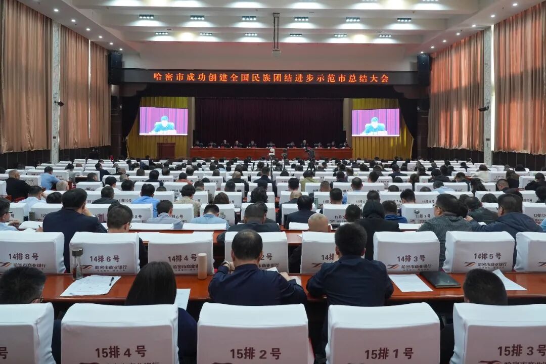 会议通报了哈密市成功创建全国民族团结进步示范市工作情况。伊州区花园乡、哈密市北控城市服务有限公司等8家单位的代表作交流发言。