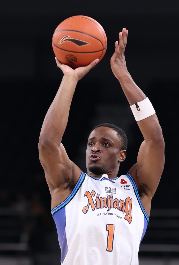 4月13日,新疆伊力特队球员纳托尔在比赛中投篮。新华社记者 孙凡越 摄