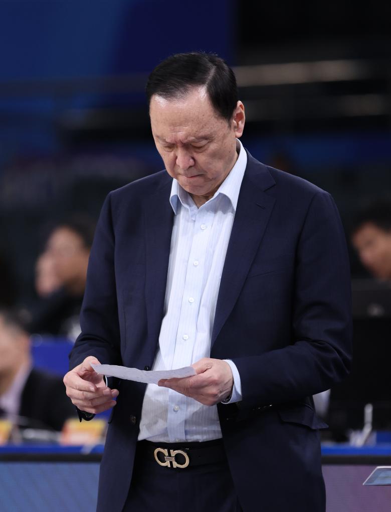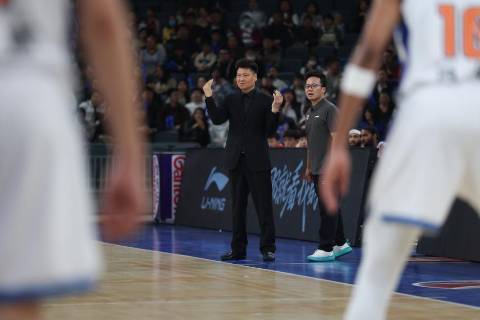 4月13日,新疆伊力特队主教练姜正秀(中)在场边指挥。新华社记者 孙凡越 摄