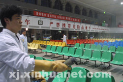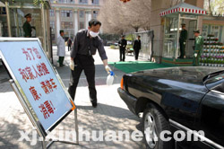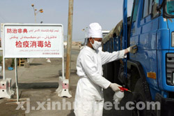 | 库尔勒市卫生防疫站的工作人员在国道314线塔石店镇消毒站对进入其境内的车辆喷洒消毒液。 |