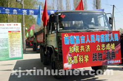 | 装载着西安南风昌吉分公司捐赠的抗"非典"消毒液的车辆正驶离厂区。 |