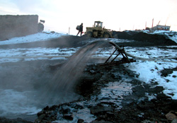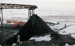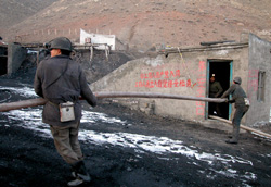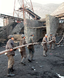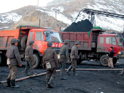 | 从透水矿井里清理出来的煤渣源源不断地运出地面。 |