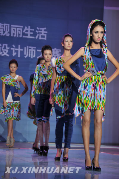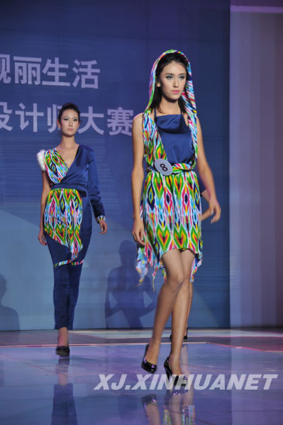 本系列以新疆维吾尔族独具特色的艾德莱斯绸为主要材料,结合现代时装的剪裁体现现代成熟女性高雅而又不乏时尚的气质。搭配西服材料,少量的蕾丝,追求舒适而又颇具民族风,色彩活泼生动,独具魄力。