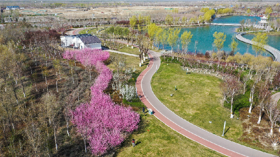 4月8日,在可克达拉市朱雀湖,盛放的洁白山楂花和一簇簇粉红的榆叶梅,吸引着游客前来拍照打卡,流连忘返。