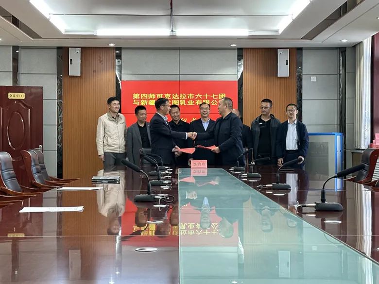 4月19日,四师可克达拉市六十七团与新疆多兰图乳业有限公司在该团机关二楼举行5000吨乳制品生产加工建设项目签约仪式。