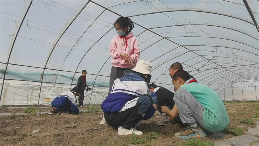 学生们来到了学校附近的蔬菜大棚,现场聆听讲解,了解蔬菜种植的基本知识,培养孩子们爱惜粮食、热爱劳动的意识。