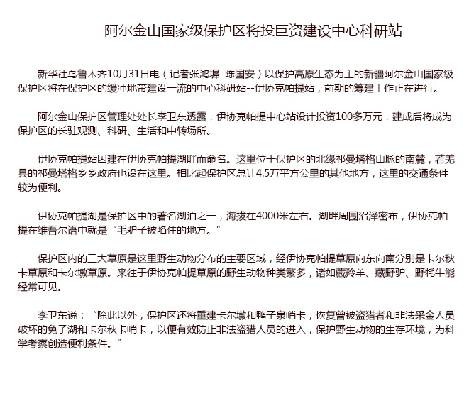 阿尔金山国家级保护区将投资巨资建设中心科研站