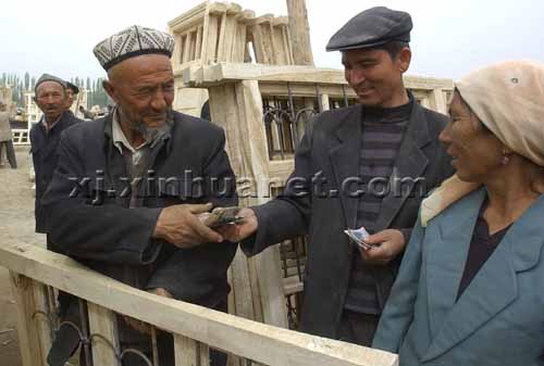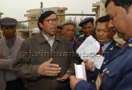 新疆巴楚县毛拉乡的吾布力·库尔班(左)在色力布亚镇“重建家园建筑建材市场”为自家新建的房子选购门窗。 |
