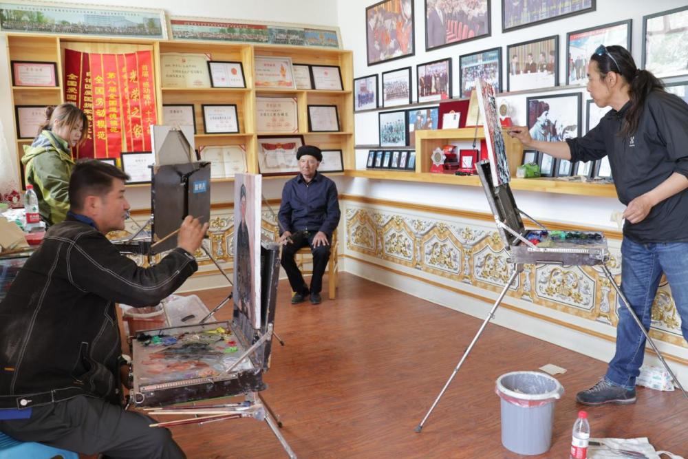 5月25日,“石榴籽”文艺小分队队员、来自新疆画院和新疆艺术学院的画家们为巴依卡老人画像。魏佚轩 摄