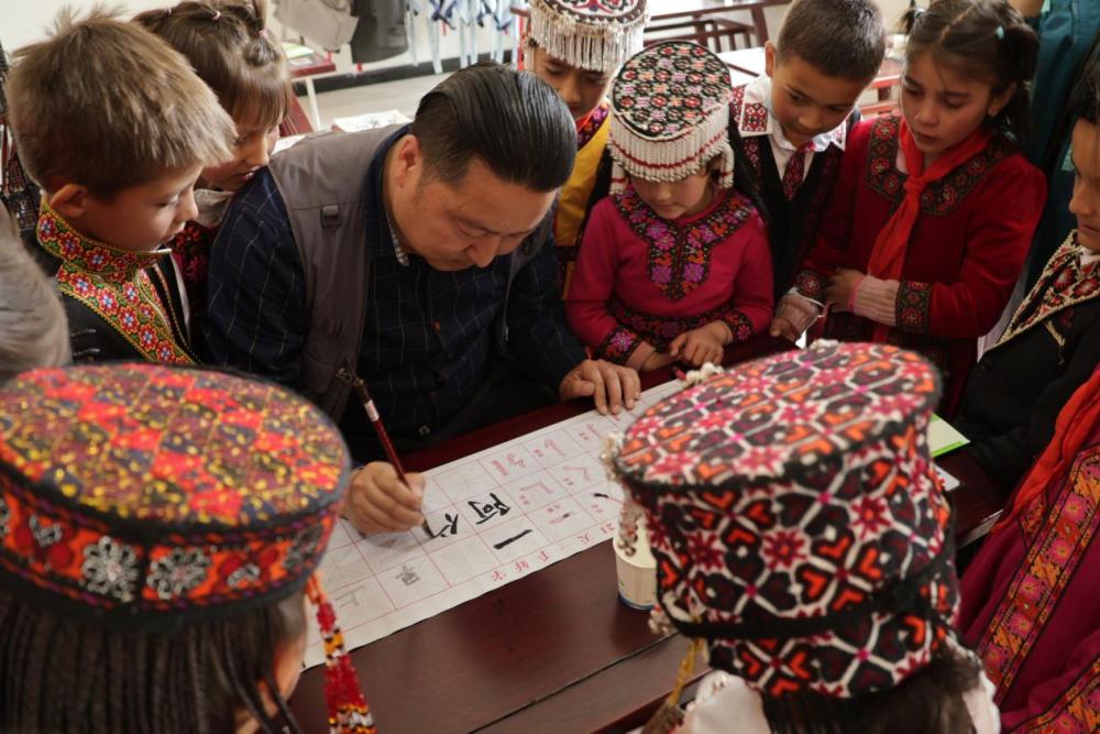5月25日,“石榴籽”文艺小分队在拉齐尼小学教授书法课。魏佚轩 摄