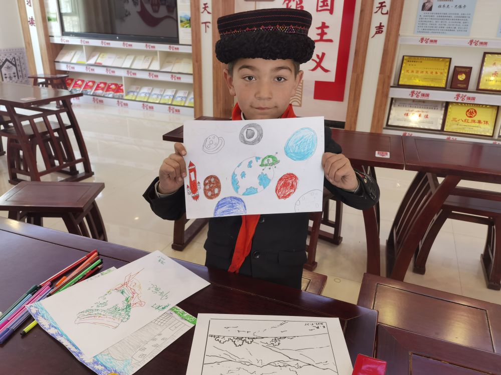 二年级的赛皮丁小朋友画出了他想象中的太空,画中有星球,有航天火箭,还有外星飞船。赛皮丁说,仰望天空时他能联想到很多,长大后有机会想到太空去看看。当记者问到他的梦想是不是当宇航员时,赛皮丁回答:“当宇航员很好,但我的梦想是保卫祖国。”