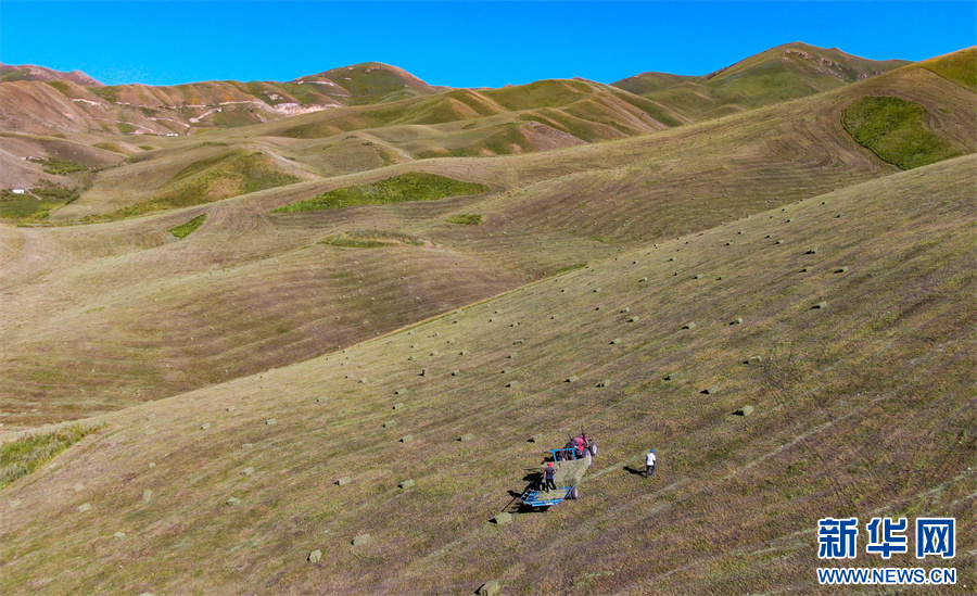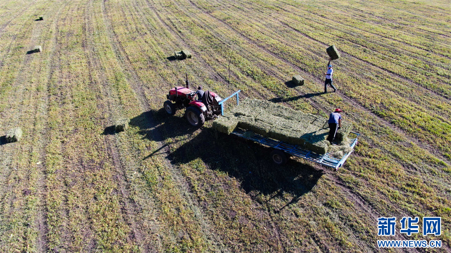 盛夏时节,新疆新源县各牧场迎来了一年一度的打草收获季。广袤的草场上,各类牧草收割机械往来穿梭,割草、搂草、打捆、装车等工作有条不紊地进行着,一个个方形草垛如珍珠般散落在草场上,勾勒出一幅热闹而壮美的草原丰收画卷。